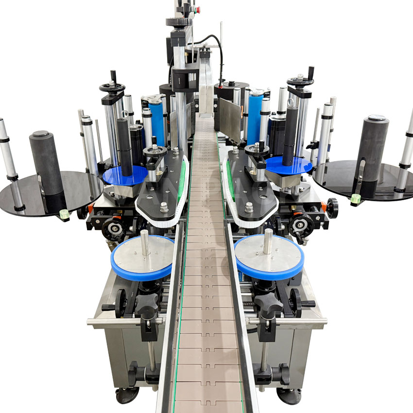 La línea tiene dos mecanismos de etiquetado que aplican las etiquetas delantera y trasera al empaque al mismo tiempo. Las etiquetas se colocan en un rollo, que se desactiva automáticamente y se pegan al paquete usando una cinta adhesiva. La línea es adecuada para operar con una alta producción que necesita optimizar y automatizar el proceso de etiquetado. Si es necesario, se puede integrar una impresora de inyección de tinta en la línea, que imprimirá automáticamente la fecha de vencimiento u otra información necesaria en la etiqueta.